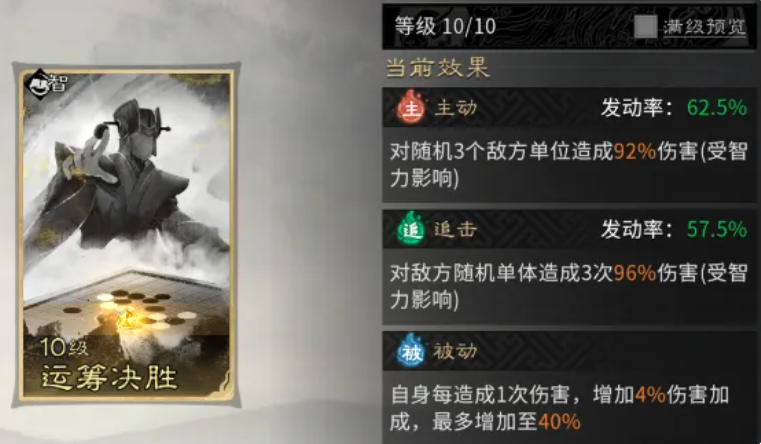 诸葛亮追击技建议更换为“运筹决胜”,其机制为每次承伤提升4%伤害,叠满10层后总增益达40%,显著放大中后期输出压力。配合贾诩“纵傀”的混乱连锁与董卓“独断专权”的群体压制,整套阵容在前3回合即可建立绝对控制优势,战斗节奏完全由我方主导,敌方关键技能几乎无法顺利释放。