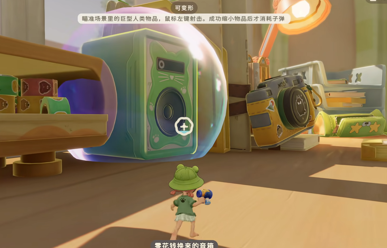 变形枪的具体用法很简单。在探索像是书桌、窗台等场景的时候,将准星瞄准原来那些巨大的日常物品,使用缩小枪发射,准星射满后物体会瞬间吸收并缩小,然后转化在背包中。在游戏世界中,你可以把缩小的巧克力棒变成建造房屋的横梁,用纸牌搭出一座小小的帐篷,还能在帐篷里美美的睡一觉。