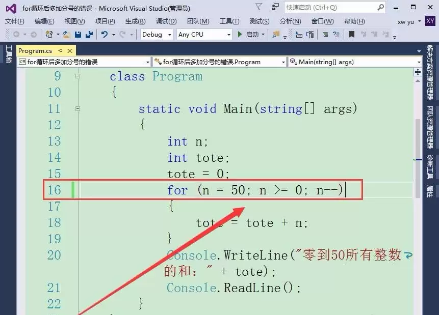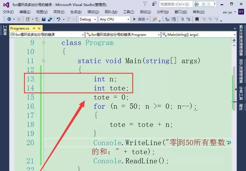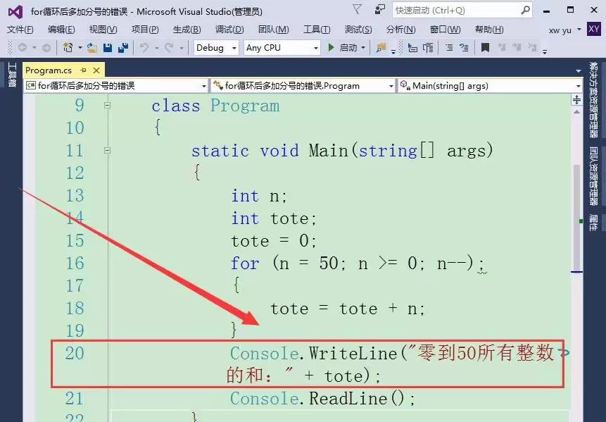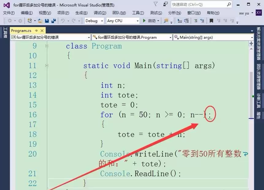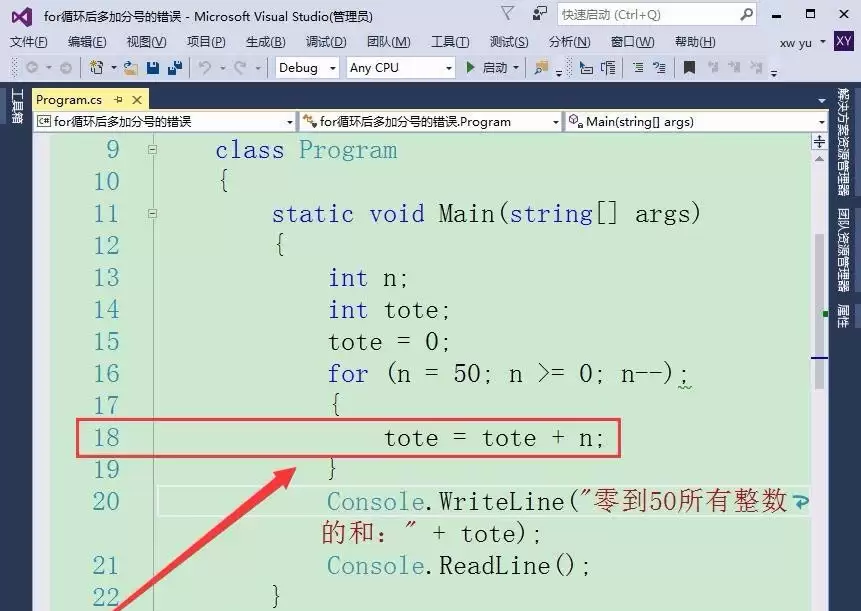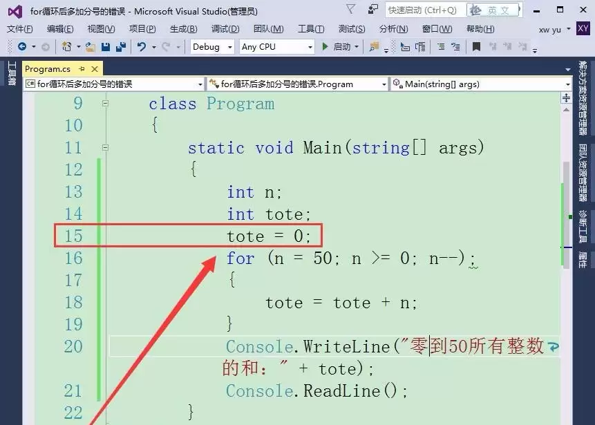 现在,将那个多余的分号删除,让累加语句正确地成为for循环体的一部分。