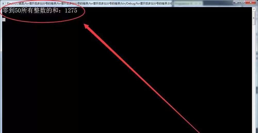 再次运行程序,控制台窗口终于输出了正确的结果:1275。这正是0到50所有整数的和。
