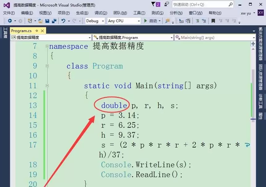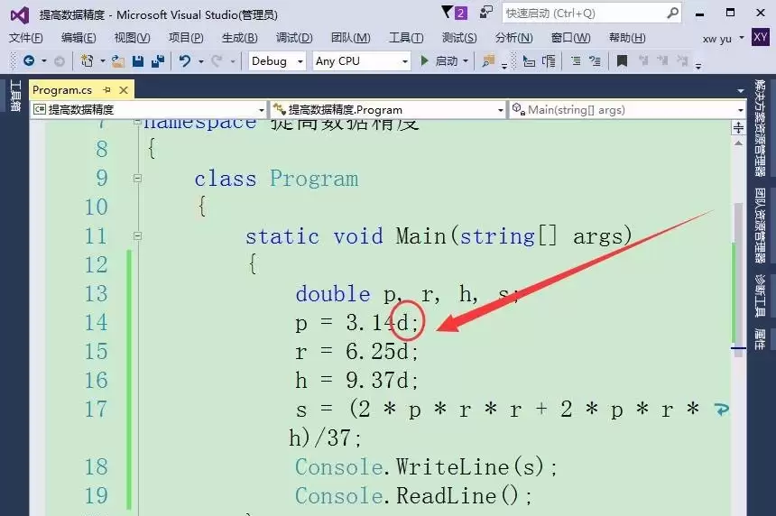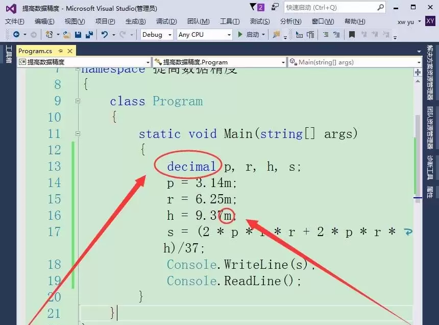 当对精度有极高要求,尤其是涉及金融、货币等不容舍入误差的计算时,`decimal`类型是更优的选择。将相关变量的类型更改为`decimal`。