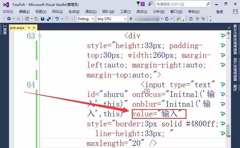 那么,这个默认显示的提示标签文字是什么呢?通过 value 属性来设置,这里我们将其初始值设为“输入”。