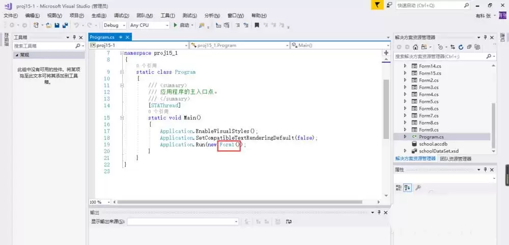 举个例子,现在红框里是“Form1”,那么当你运行项目时,第一个弹出的窗口自然就是Form1,如下图所示。