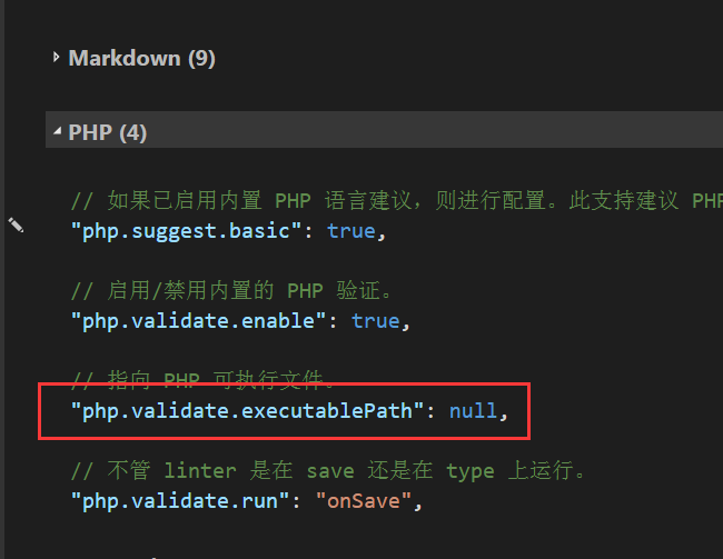 接着,在设置项中找到“PHP”分类,定位到“php.validate.executablePath(PHP可执行文件地址)”这一项。