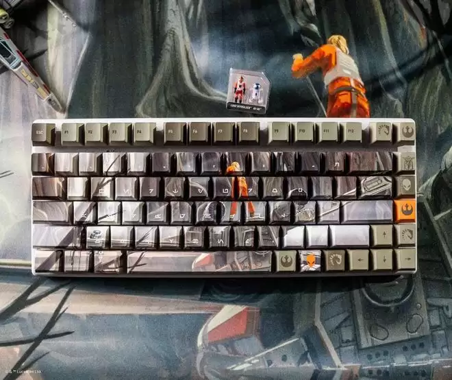 这套联名产品的设计灵感,直接源于影史经典。四套键帽和鼠标垫所展示的图案,均取材自已故知名概念设计师Ralph McQuarrie为《星球大战》构思的原始艺术场景。这些设计不仅是电影的基石,如今也成为了玩家桌面上的一道风景。