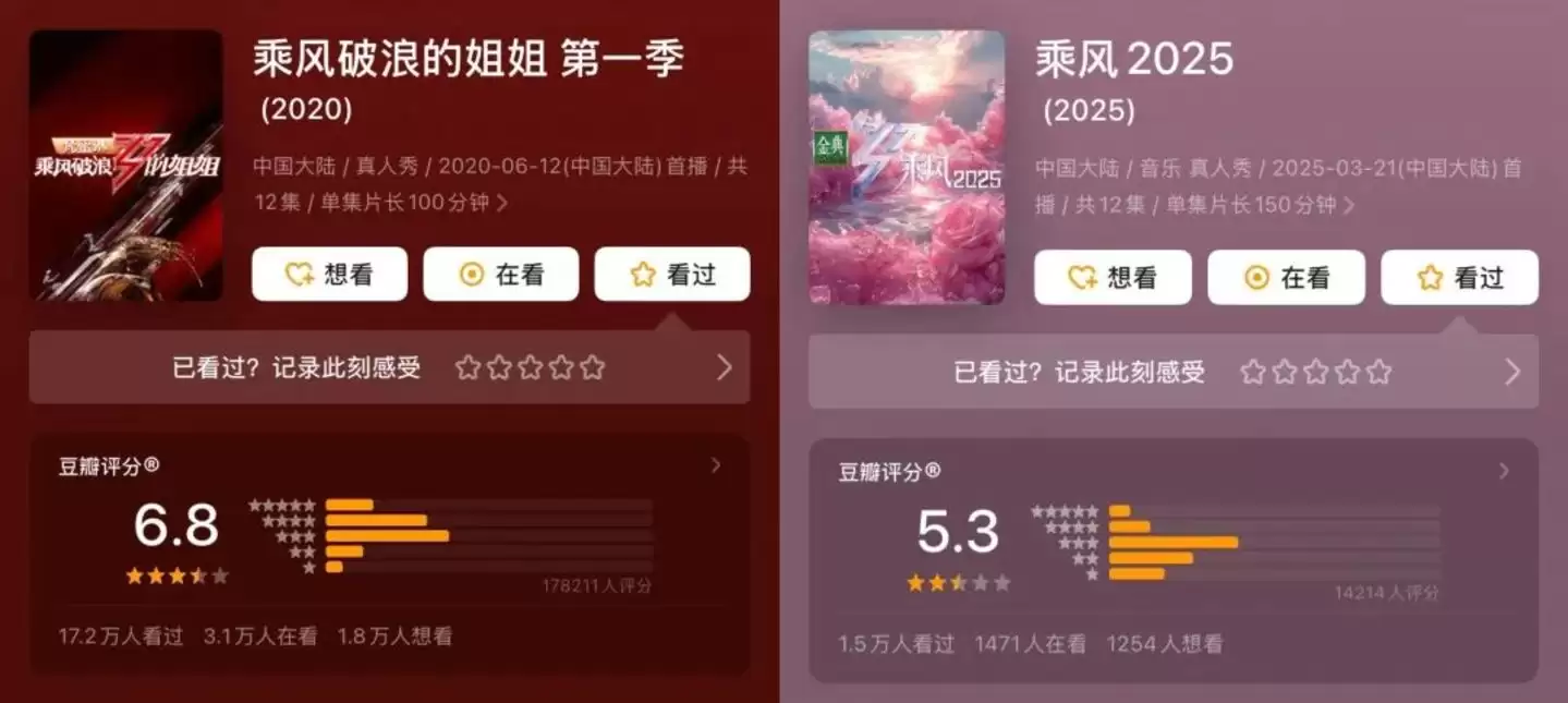 走到第七个年头,《浪姐》还剩下什么?豆瓣评分从第一季的6.8分一路跌至第六季的5.3分;“选女团”早已是缘木求鱼;甚至连广告投放都不再精准。节目赞助商从巅峰时期的15家锐减至5家;直播观看量9000万,录播播放量仅1500万,数据落差巨大。从第三季开始,“姐姐”二字已从节目副标题中消失。《浪姐》从一个标榜女性高光的舞台,蜕变为一个竭力讨好流量、充满算计的“斗兽场”。但如今的观众,真的喜欢看“把人摁进水里”的戏码吗?若真如此,短剧、漫剧中有的是更极致的冲突,何必打开一集动辄上百分钟的长综艺?观众或许早已疲惫:我们真的不想再看中年女性“没苦硬吃”了。