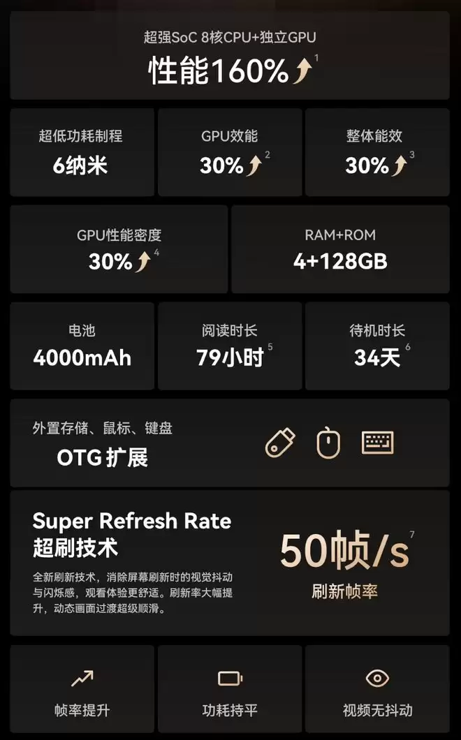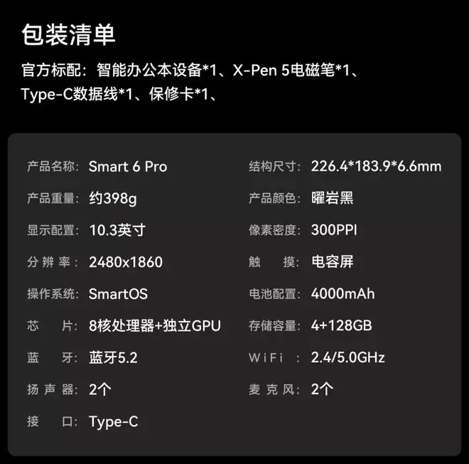 核心配置方面,Smart 6 Pro搭载了一颗“8核处理器”,并配备了4GB运行内存和128GB的机身存储空间,为系统的流畅运行和多任务处理提供了硬件基础。续航则由一块4000mAh的电池负责,足以满足长时间的阅读需求。系统层面,它运行的是基于安卓深度定制的SmartOS。