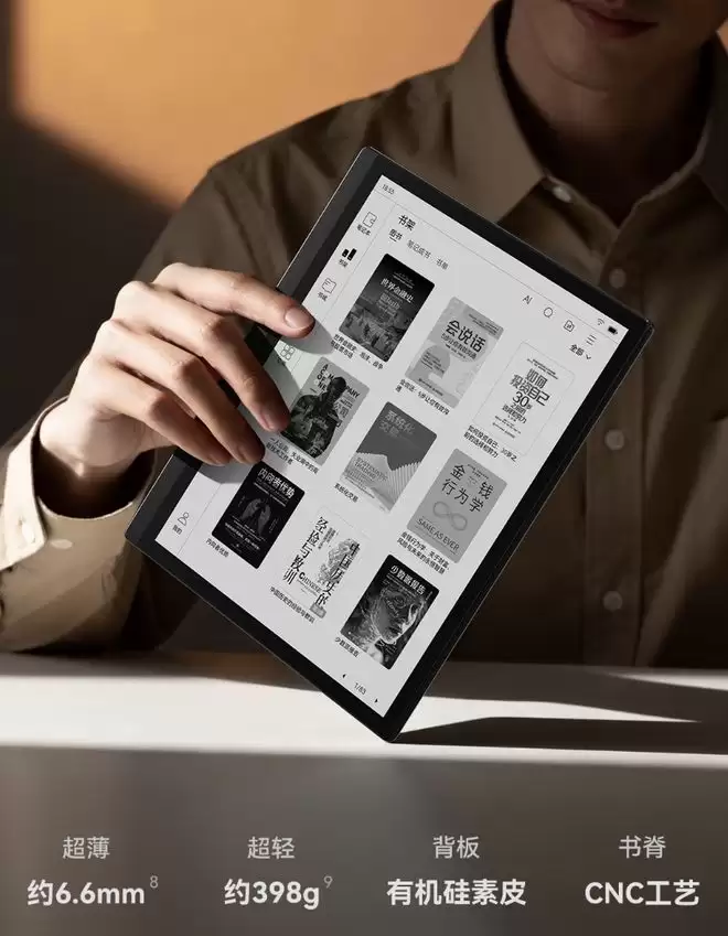 新品提供了曜岩黑一种配色选择。在便携性上,这款电纸书做得相当到位,整机重量控制在398克,厚度仅为6.6毫米,握持感值得期待。其背板采用了亲肤的有机硅素皮材质,书脊部分则运用了CNC加工工艺,兼顾了质感与耐用性。