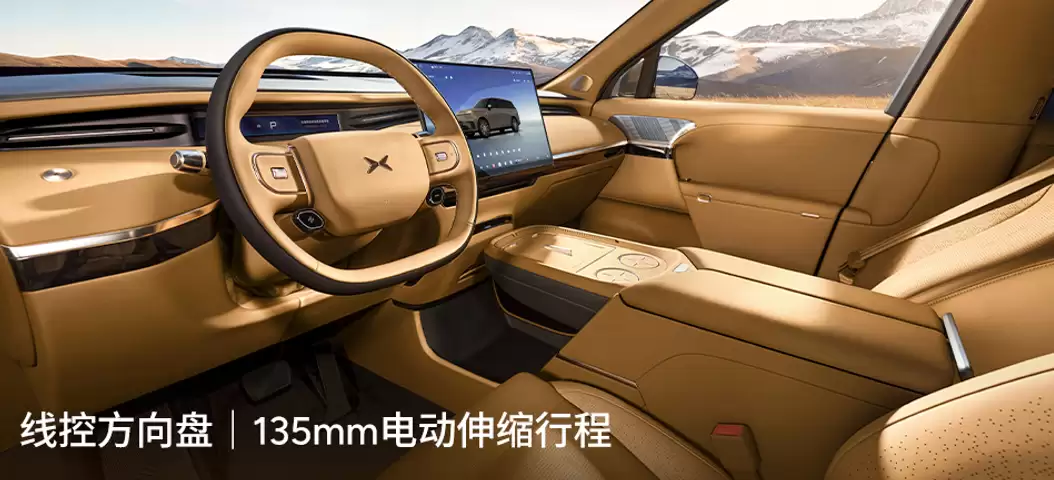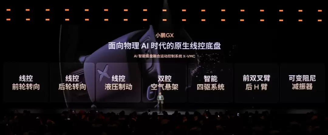 操控性能是小鹏GX的另一大亮点。它搭载了面向物理AI时代的原生线控底盘,深度融合了X-VMC智能融合系统、线控液压制动、线控前/后轮转向、双腔空气悬架以及智能四驱系统。