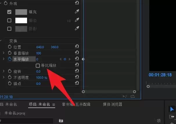 然后,切换到“效果控件”面板。找到刚才创建的矩形形状的属性,里面会有一个“缩放”选项。通常默认是“等比缩放”被勾选的,这里需要点一下,把这个勾选去掉。这样一来,我们就可以单独控制宽度或高度的变化了。去掉勾选后,直接把“水平缩放”的数值设置为“0”。这意味着,在这一帧,我们的长条在水平方向上被压扁到完全看不见,动画的起始状态就设置好了。