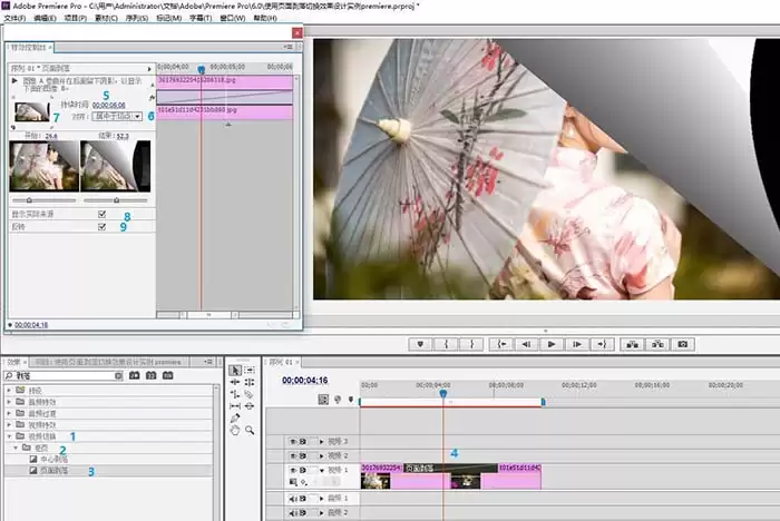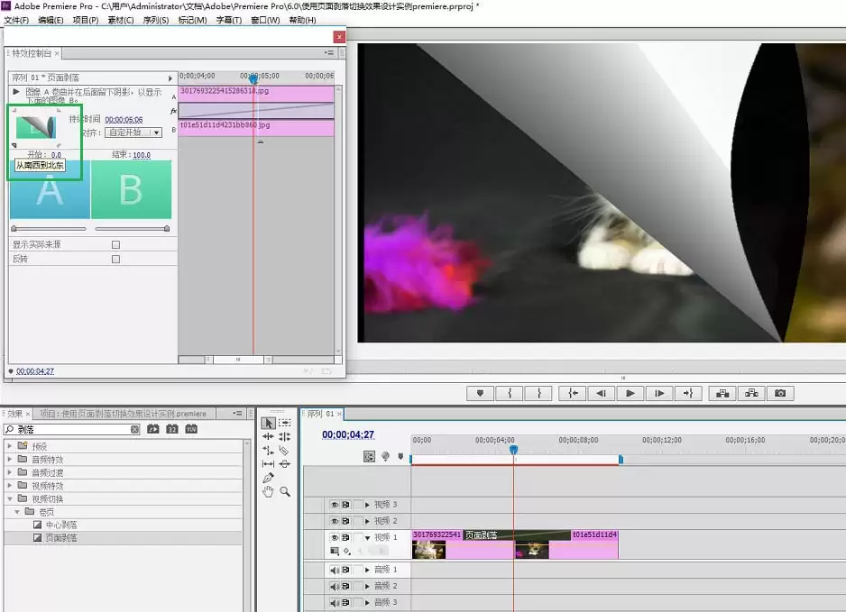最后这个设置能让翻页效果更符合你的叙事逻辑。选中效果图标,在“效果控件”面板里,你会看到“方向”的选项。如图所示,从这里你可以调整翻页是从左下角开始还是右上角开始。不同的方向,带来的视觉流向和情绪暗示也略有不同,不妨多试试。