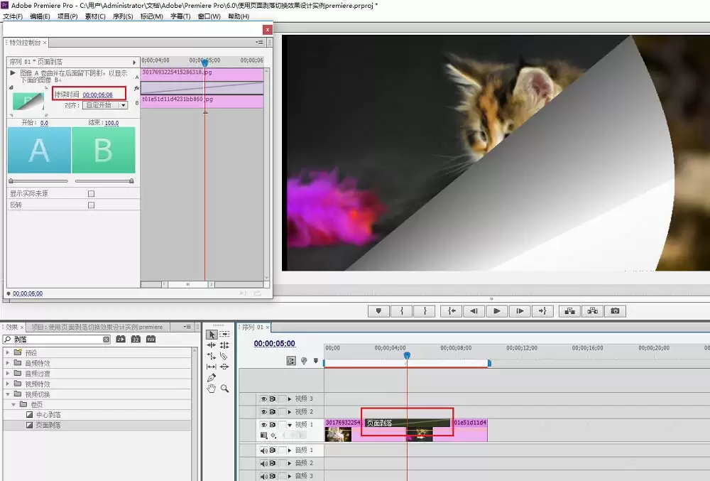 重头戏来了。在“效果”面板中,搜索“页面剥落”这个视频过渡效果。找到后,直接将它拖拽到时间轴上两段素材的衔接处。如图所示,效果会自动添加到切点上。这里有个细节:效果图标覆盖的范围,就是翻页动画的持续时间。