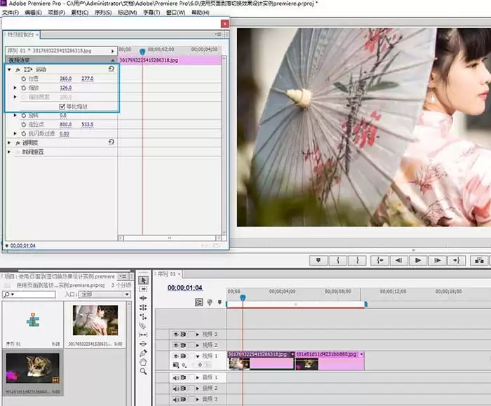 如果你的图片尺寸和序列画幅不匹配,这一步就很关键了。在效果控件面板里,找到“运动”下的“缩放”参数,如图所示,对图片元素的大小进行精细调整,确保它能填满画面或达到你想要的构图。