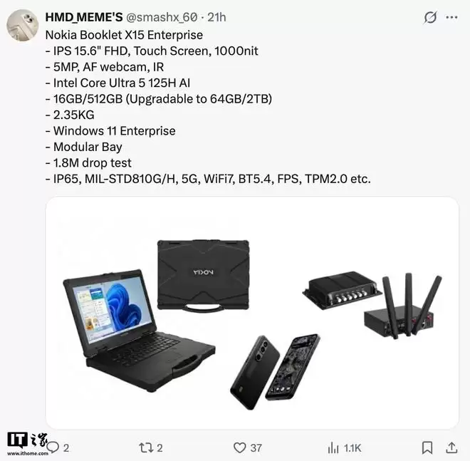 最近有消息传出,诺基亚似乎正在酝酿一个“文艺复兴”计划——准备让沉寂已久的Booklet品牌重出江湖。据消息源smashx_60透露,这次的主角是一款名为X15 Enterprise的三防笔记本。值得注意的是,产品上搭载的Logo是诺基亚新版标识,这通常意味着它是一款由诺基亚主导的正统新品,而非此前那些由OFF Global操刀的纯贴牌产品。