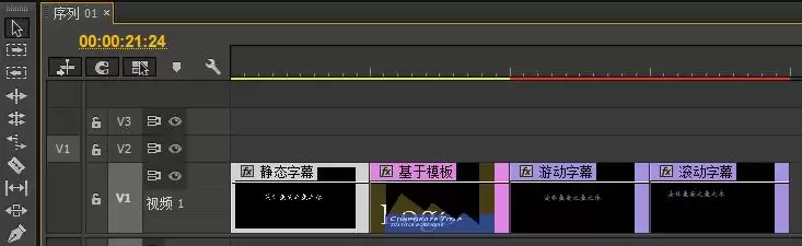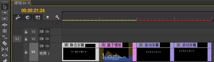 所有字幕创建完毕后,回到项目面板看一眼,就会发现一个有趣的区别:静态字幕和基于模板的字幕,其图标格式类似于图片;而游动字幕和滚动字幕,则显示为视频格式。这一点在管理素材时需要留意。