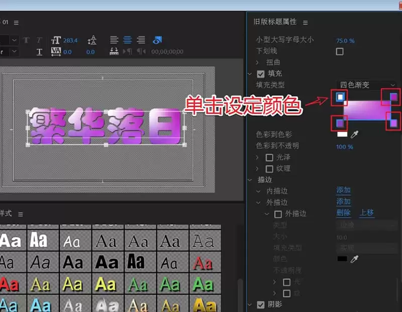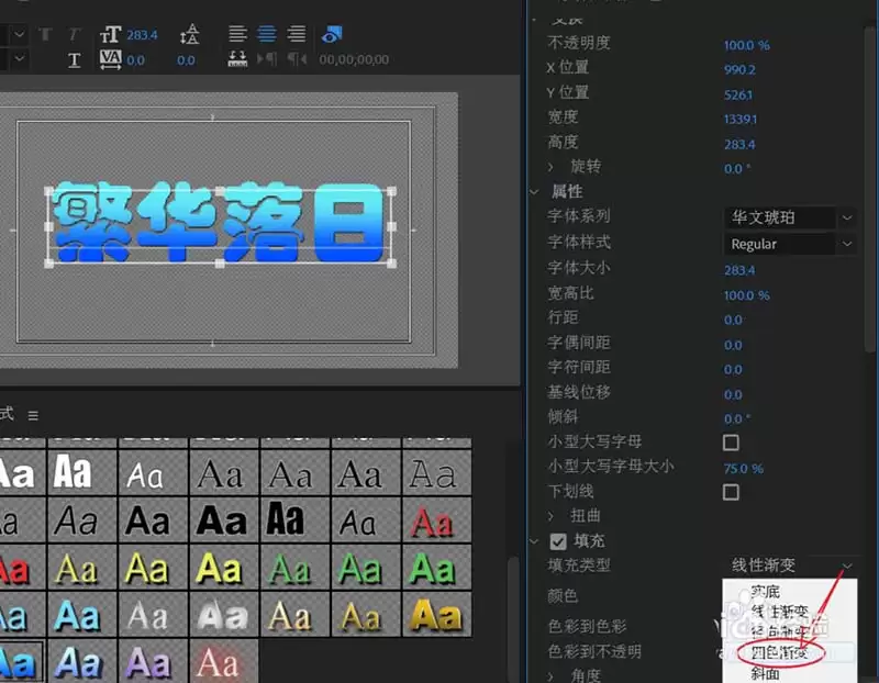 想让文字颜色也“传统”起来?那就得用到右侧的“旧版标题属性”面板。展开“填充”选项,将填充类型从“实底”更改为“四色渐变”。这个功能能让一个字同时呈现四种颜色的平滑过渡,非常适合制作复古或华丽的文字效果。