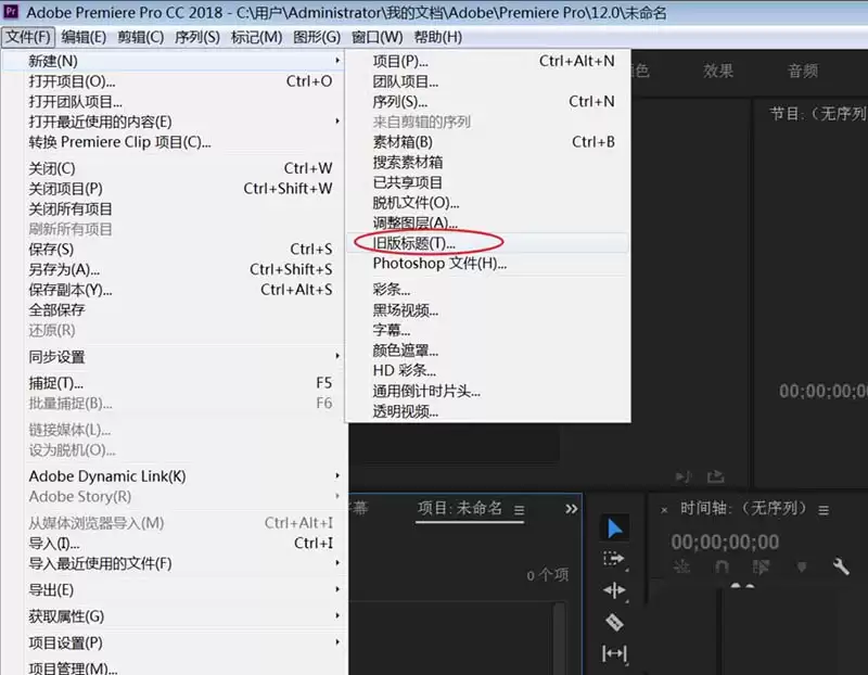地基有了,接下来制作核心的“道具”——字幕。同样在“文件”菜单下,找到“新建”>“旧版标题”。这个“旧版标题”工具,正是我们调用丰富字体样式的秘密武器。