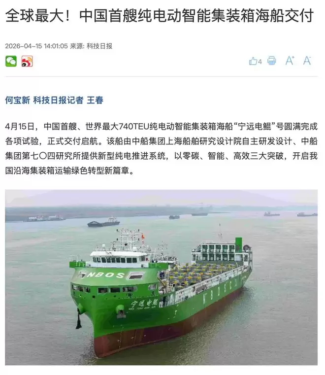 航运业的绿色革命,又向前迈出了标志性的一步。近日,中国首艘、同时也是全球最大的740TEU级纯电动智能集装箱船——“宁远电鲲”号,在圆满完成各项试验后,正式交付启航。