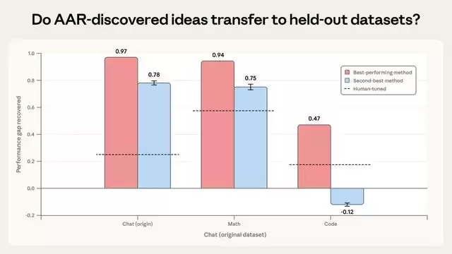 Anthropic进行了两项验证测试。首先,将AI发现的最佳方法应用于全新的数学和代码任务。结果显示,最佳方法在数学任务上PGR达到0.94,在代码任务上为0.47(虽是基线两倍,但表现有所下降)。次优方法在数学上尚可,在代码任务上反而使结果恶化。这说明方法具备一定的迁移能力,但泛化性并不稳定,严重依赖于具体的数据集和任务结构。