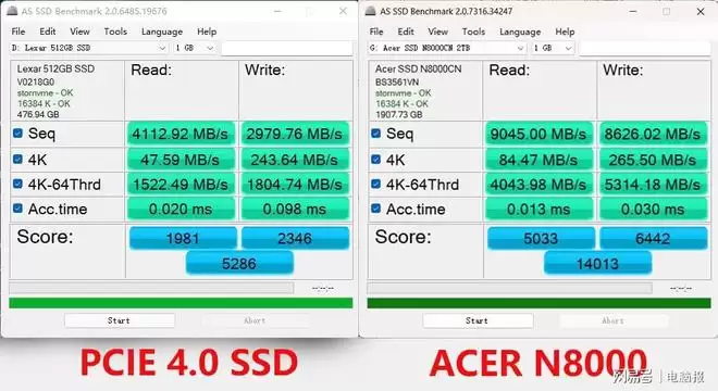 为了更直观地展示宏碁ACER N8000的性能优势,我们使用PCIe 4.0的系统盘进行了对比测试。可以看到在AS SSD Benchmark测试中,ACER N8000的连续读取速度达到9045MB/s,连续写入速度达到8626MB/s,而4K-64Thrd多列随机读取写入也保持在4043.98MB/s和5314.18MB/s,综合性能得分14013分。相比PCIe 4.0 SSD,ACER N8000的性能优势非常明显,顺序读写性能领先PCIe 4.0 SSD约115%,随机读写性能领先幅度更是达到了178%。