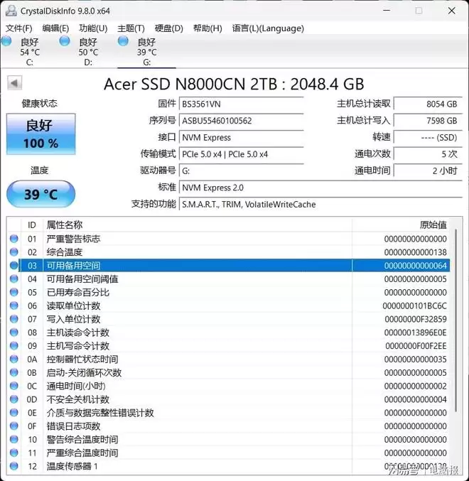 安装在测试平台上、分配分区并格式化之后,系统显示SSD的可用空间为1.86TB,用CrystalDiskInfo顺利识别出宏碁ACER N8000的所有参数信息,在室温25℃的情况下硬盘待机温度为39℃,待机温度很低。