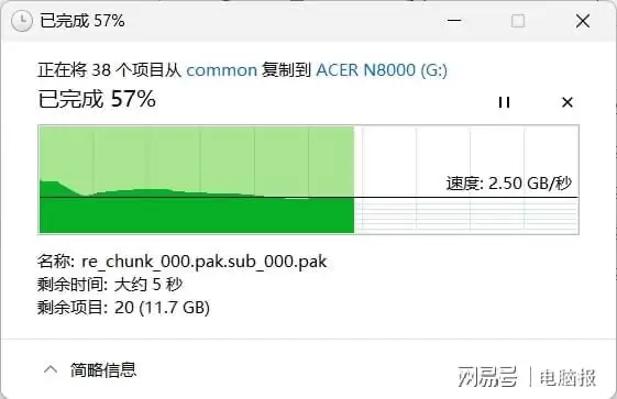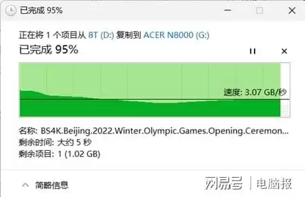 实际的文件拷贝测试中,我们选择了大容量的电影文件以及游戏客户端来分别模拟大文件和小文件的写入情况。首先复制了一部容量为25GB的电影文件,用时7.8秒,平均写入速度3.2GB/s。接下来拷贝拥有2000个小文件的游戏客户端,总大小27GB,一共用时10.3秒,平均写入速度2.6GB/s。由于拷贝盘是PCIe 4.0 SSD存在性能瓶颈,达不到宏碁ACER N8000的峰值性能,但这个读写表现在日常的使用中都能获得极致顺畅的体验。