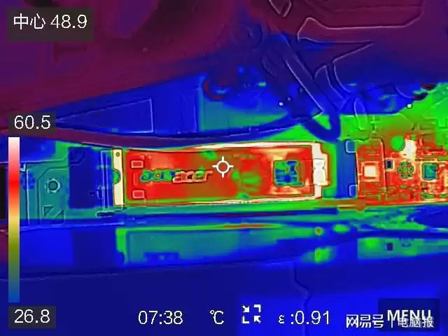 除了性能之外,宏碁ACER N8000的亮点就是搭载了低功耗的6nm制程主控,搭配覆盖主控和颗粒的石墨烯贴纸散热贴,工作温度能够得到稳定控制。为了测试ACER N8000的发热控制情况,我们对SSD进行了温度压力测试。测试方法是使用CrystalDiskMark完整跑一轮测试,然后用软件和热像仪分别记录安装和不安装散热片时的温度情况。