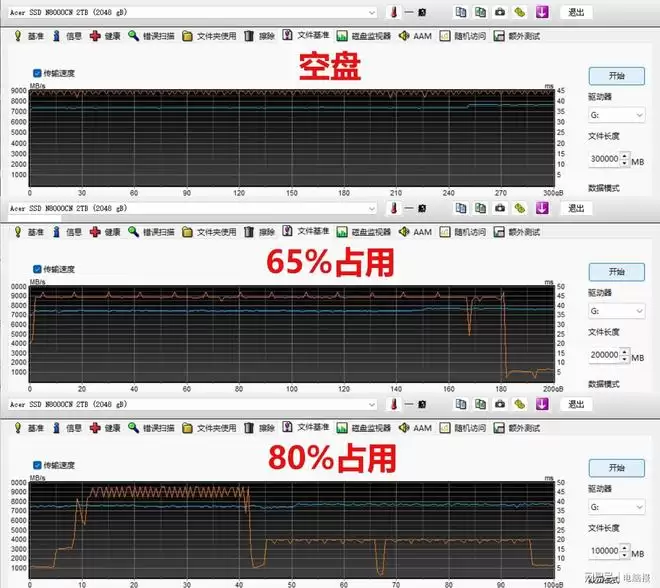 宏碁ACER N8000采用了HMB+SLC Cache智能缓存技术,使其拥有了强悍的性能,为了测试这款SSD的SLC缓存策略,我们使用HD Tune中的文件基准对进行测试。在空盘状态下,ACER N8000的缓存容量超过了300GB。65%占用下,SSD的缓存容量为180GB左右。而在80%占用下,连续写入超过40GB会降速成4000MB/s左右,超过90GB以上才会真正出缓。按照这个数据,ACER N8000的SLC缓存容量即使在接近满盘的状态下也足够满足超大文件的传输需求,日常使用完全不用担心缓存问题。