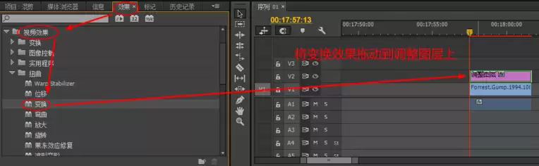 第二步:为调整图层赋予“变换”的力量。 接下来,调整这个图层的长度,让它刚好覆盖住你希望变焦发生的时间范围。然后,去效果面板里找这个核心工具:依次点开“效果” > “视频效果” > “扭曲”组,找到“变换”效果。把它直接拖到时间轴的调整图层上。