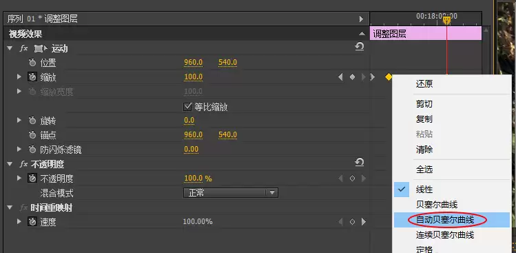 但想让缩放过程更平滑自然,有个小技巧:在效果控件里框选刚创建的两个关键帧,右键点击,在弹出的菜单里选择“自动贝塞尔曲线”。这个操作能让速度变化更流畅,避免生硬的机械感。