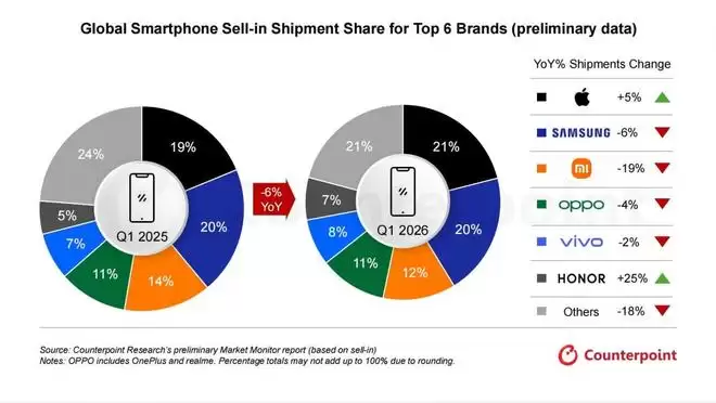 您的位置:首页 >机构:2026年Q1全球智能手机出货量同比下降6% 荣耀、苹果实现正增长