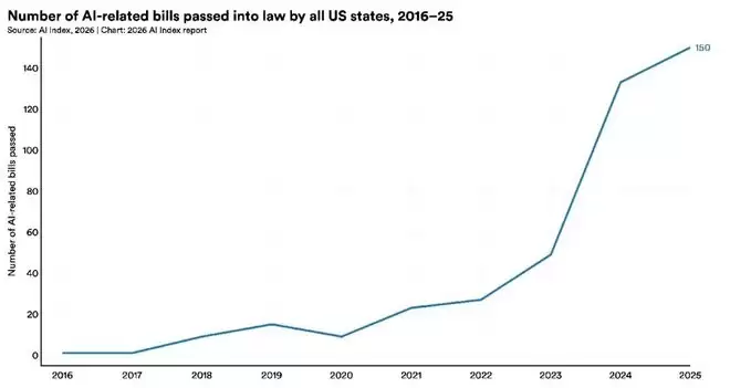 与此形成对比的是,美国联邦政府层面走向了“去监管化”。特朗普总统签署行政命令,试图限制各州对AI的监管权限。然而,尽管联邦层面如此,美国各州立法机构却异常活跃,在一年内通过了创纪录的150项AI相关法案。其中,加州的立法具有标志性意义,例如SB 53法案要求AI模型开发者履行安全披露义务,并为举报者提供保护。纽约州则通过了RAISE法案,要求AI公司公开安全规范并报告重大安全事件。