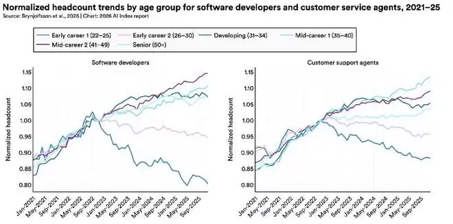 尽管部署仍处早期,但AI对就业市场的影响已初现端倪,尽管精确量化还为时过早。一些研究显示,AI正开始影响特定行业,尤其是年轻从业者。斯坦福经济学家2025年的一项研究发现,22至25岁软件开发者的就业人数,自2024年以来下降了近20%。这一变化虽不能全部归因于AI,更广泛的经济环境也是因素之一,但AI在其中扮演的角色已不容忽视。