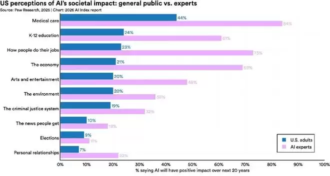 然而,一个显著的认知鸿沟横亘在专家与普通公众之间,其中最大的分歧出现在对就业影响的判断上:高达73%的专家认为AI将对人们的工作方式产生正面影响,但在美国公众中,持此乐观看法的人仅有23%。在AI对教育和医疗的影响上,专家同样比公众更为乐观。不过,双方在一个问题上达成了共识:都认为AI可能对选举和人际关系产生负面影响。