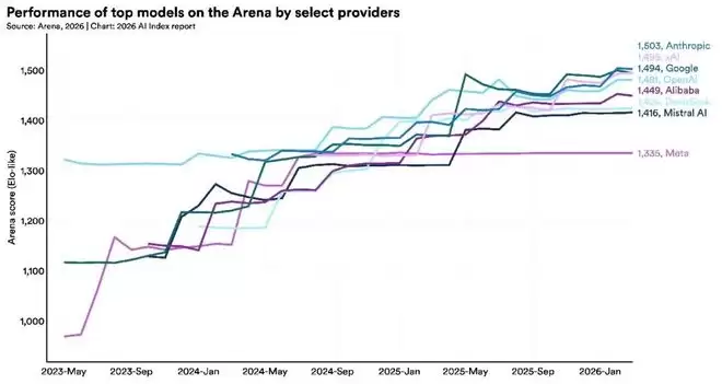 截至2026年3月的最新排名显示,Anthropic位居榜首,紧随其后的是xAI、Google和OpenAI。而DeepSeek、阿里巴巴等中国模型的表现同样不容小觑。可以说,顶尖AI模型之间的性能差距已被压缩到“发丝之细”,竞争焦点正从单纯的性能比拼,转向成本、可靠性和实际可用性等更深层次的维度。