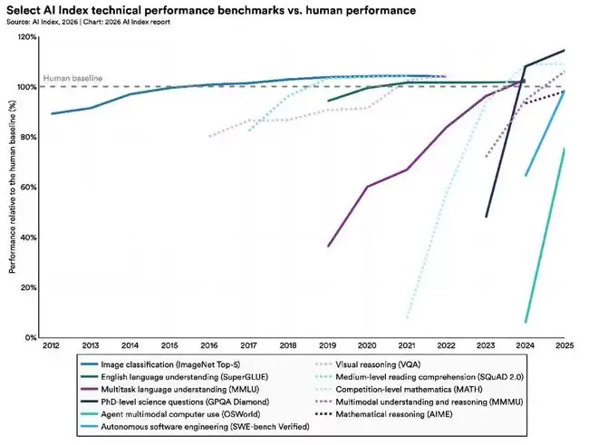好在,斯坦福大学以人为本人工智能研究所(HAI)每年一度的“AI成绩单”如期而至,为我们拨开迷雾,提供了一份基于数据的冷静观察。这份报告揭示了一个核心矛盾:AI技术本身在狂奔,而我们的社会管理、评估体系乃至就业市场,却还在手忙脚乱地“找鞋穿”。