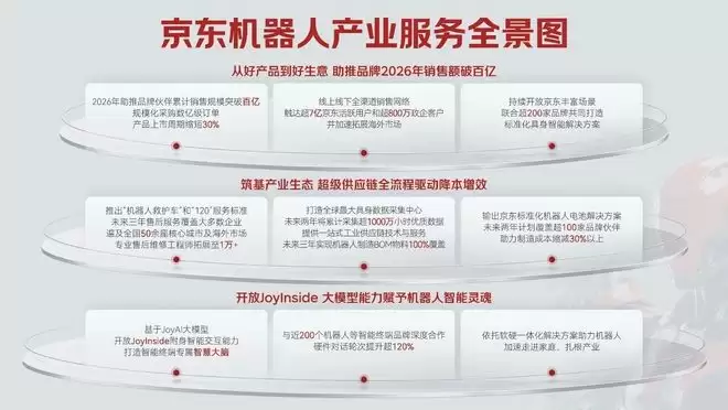 4月15日,京东黑板报发布消息,京东机器人机甲联盟确认将再次登场,亮相于2026年北京亦庄半程马拉松暨人形机器人半程马拉松赛事当天。选择在这个备受瞩目的科技与体育盛会前夕,京东正式对外发布了其“机器人产业服务全景图”。这份全景图的核心意图非常明确:聚焦品牌合作、产业筑基和技术赋能这三大能力,目标直指推动整个机器人产业生态迈向一个新的发展阶段。
