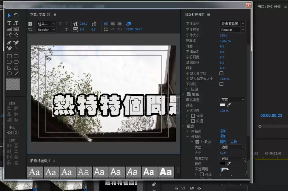 点开“旧版标题”编辑器,很多老用户都会会心一笑。这个界面功能全面,堪称字幕制作的“瑞士军刀”。在这里,你不仅可以自由输入和修改文字,还能精确控制字体、字号、颜色、间距、描边、阴影,最关键的是,可以轻松添加或移除背景框,并对背景框的颜色、透明度、圆角等进行全方位定制。对于需要精细控制字幕样式的项目来说,它的效率和自由度要高得多。