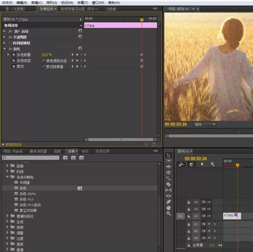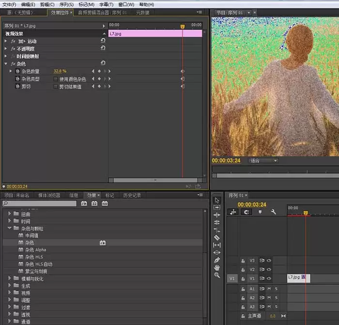 添加只是第一步,如何调整才是精髓所在。选中时间轴上的素材,然后切换到左上方的“效果控件”面板。在这里,你可以看到刚刚添加的“杂色”效果的所有可调参数,真正的魔法将从这里开始。