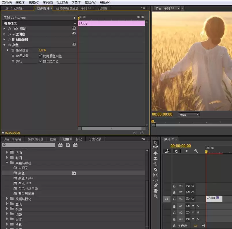 关键的道具来了。在软件右侧的效果面板里,找到“视频效果”文件夹,接着点开“杂色与颗粒”子菜单。你会发现一个叫做“杂色”的效果,把它拖到时间轴的视频素材上。看到素材顶部出现一条绿色的线,就说明效果添加成功了。