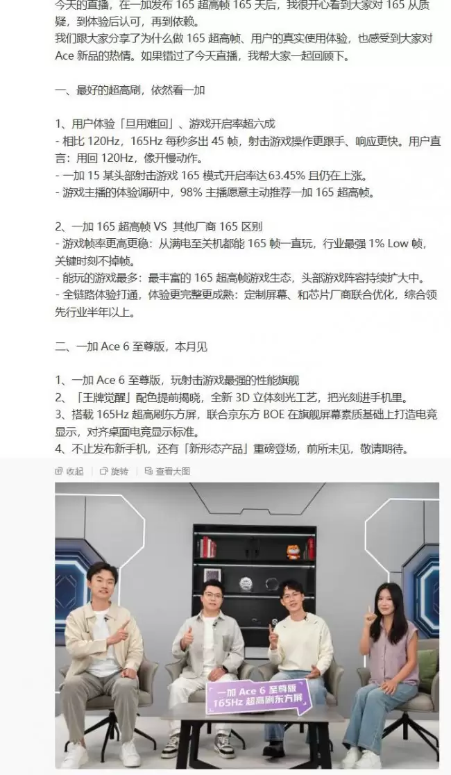 根据官方介绍,这次主打的「王牌觉醒」配色可不简单,它运用了全新的 3D 立体刻光工艺,想必在光影流转间会带来独特的质感。更值得关注的是屏幕配置——新机将搭载一块 165Hz 超高刷新率的东方屏,其素质直接对齐了京东方 BOE 的旗舰标准。一加这次的口号很明确:要将手机屏幕的流畅体验,提升到桌面电竞显示器的水准。