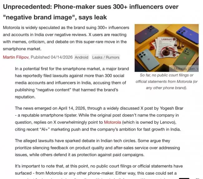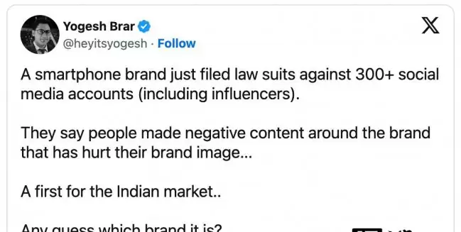 这事儿最近在科技圈里传得挺热。据知名爆料人 Yogesh Brar 在 X 平台发布的消息,有一家手机制造商在印度市场采取了一项颇为强硬的举措——一口气起诉了超过300个社交媒体账号。指控的核心,是这些账号涉嫌发布了损害该品牌声誉的“负面内容”。