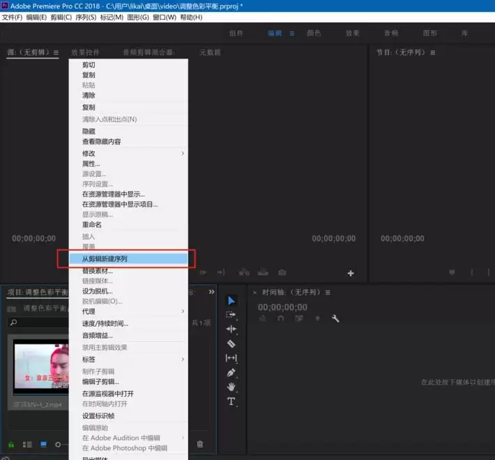 5、接下来很关键:在项目面板中,右键单击你刚刚导入的视频素材,然后在右键菜单中点击“从剪辑新建序列”。这个操作能快速创建一个与视频属性完美匹配的时间线序列,省去手动设置的麻烦。