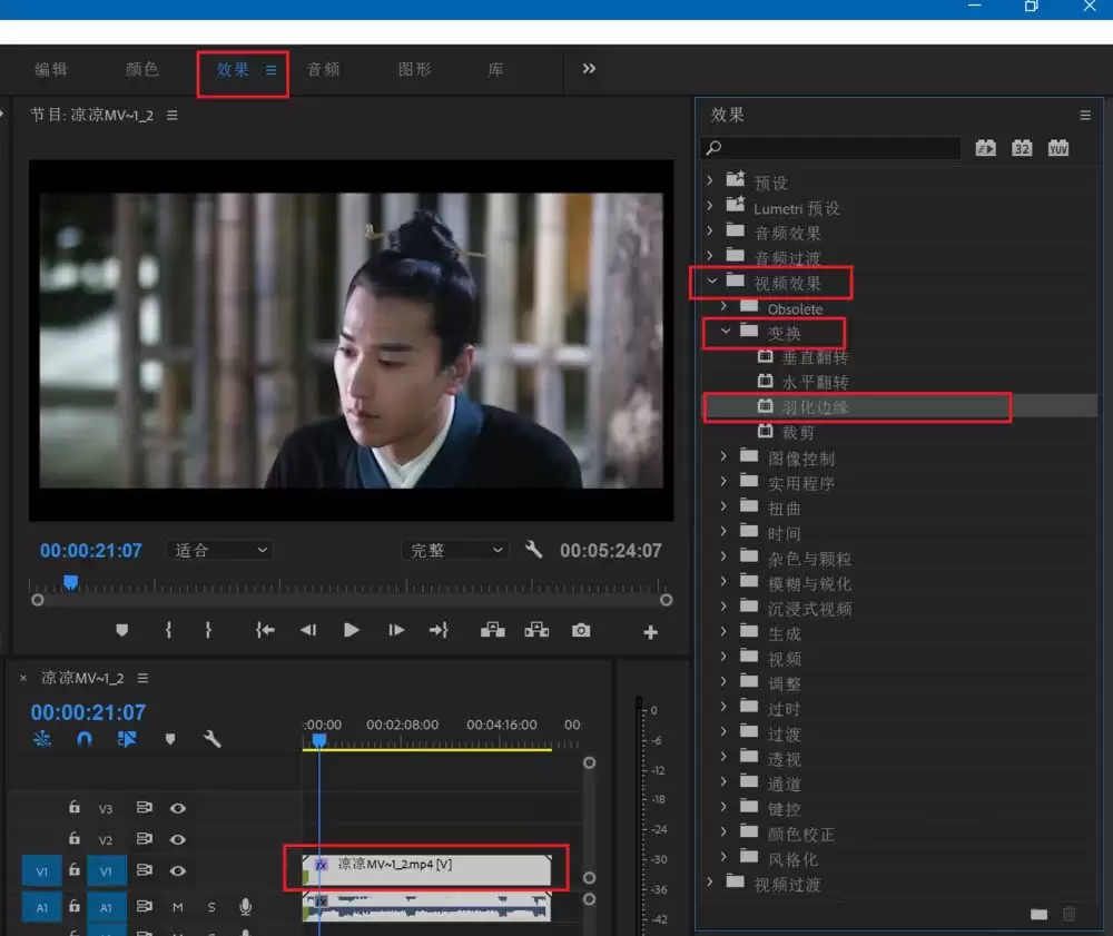 6、序列创建后,视频会自动出现在时间轴轨道上。用鼠标点击选中这个视频轨道,然后将目光移到软件右上方,点击“效果”面板。在这里,找到“视频效果”文件夹,展开它,继续找到“变换”组,你会发现“羽化边缘”这个效果。直接双击它,效果就应用到选中的视频上了。