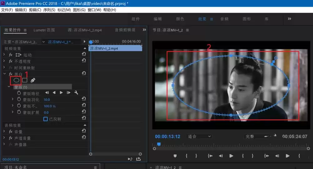 第六步,这才是实现“局部黑白”的精髓。点击视频轨道后,查看软件左侧的“效果控件”面板。找到刚刚添加的“黑白”效果,你会看到其下方有“创建椭圆形蒙版”或“创建4点多边形蒙版”的选项。点击其中一个,视频画面上就会出现对应的蒙版控制点。通过调整这些控制点的位置和蒙版的羽化、扩展参数,你可以精确框选出需要变为黑白的区域。蒙版内部是黑白效果的作用范围,而外部则会恢复彩色。