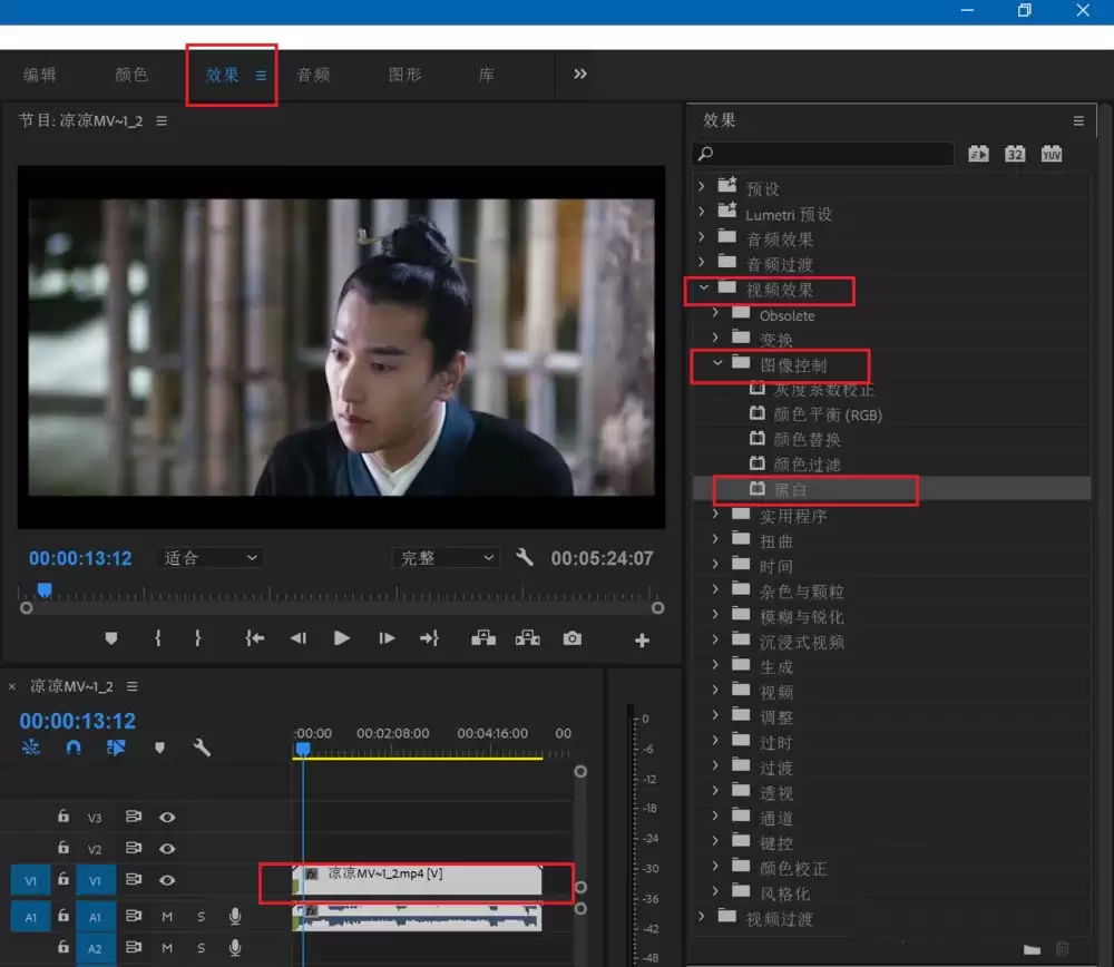第五步,关键操作来了。在时间线面板上,点击选中你的视频轨道。接着,将视线移到软件右侧的“效果”面板,展开“视频效果”文件夹,找到其下的“图像控制”分类。在这里,你会看到“黑白”效果。直接双击它,效果就会被应用到选中的视频轨道上。此时,整个画面会暂时变为黑白。