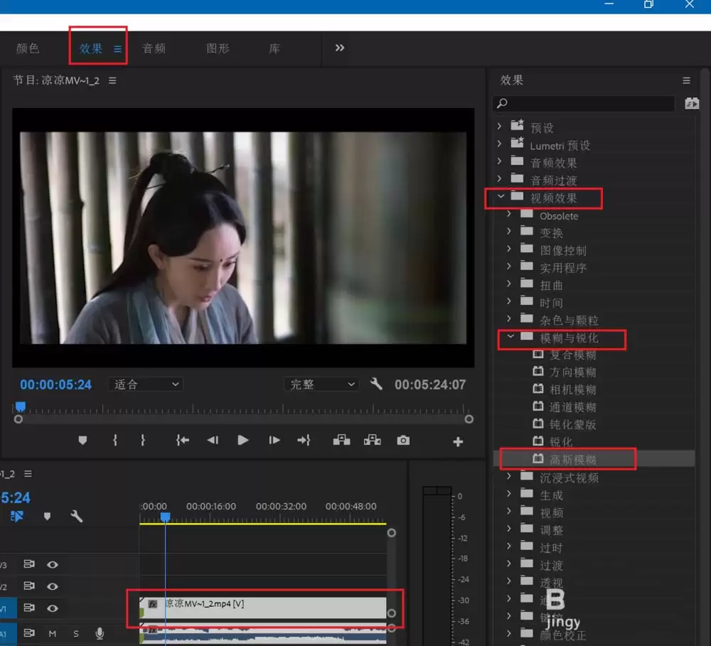 关键步骤来了。在时间轴面板中,点击选中你的视频轨道。然后,将视线移到软件右侧,找到“效果”面板。在里面依次展开“视频效果” -> “模糊与锐化”,就能看到“高斯模糊”效果了。直接把它拖到时间轴的视频片段上。