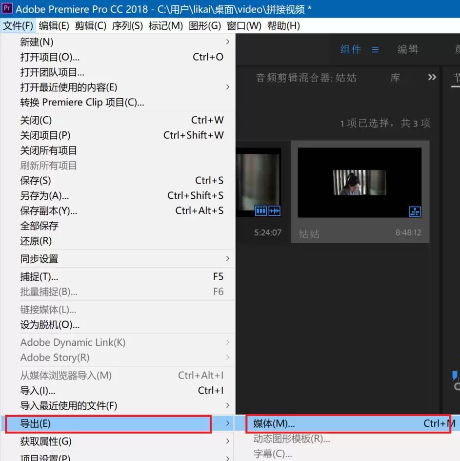 效果满意之后,最后一步就是输出了。再次点击“文件”菜单,选择“导出” -> “媒体”。