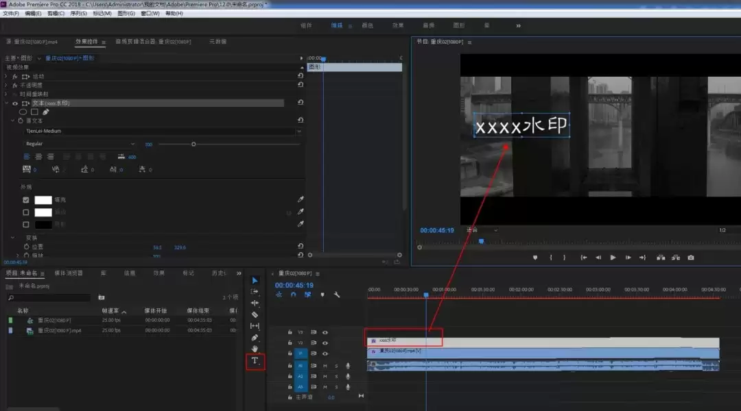 首先,当然是打开PR,新建项目并把你的视频素材拖到时间轴轨道上。接下来,就是创建水印本身了。使用工具栏里的“文字工具”,直接在节目监视器面板上点击并输入你的水印文字——这里我们暂且用“XXX”来示意。当然,如果你有设计好的Logo图片,直接导入并放到视频轨道上方也一样。