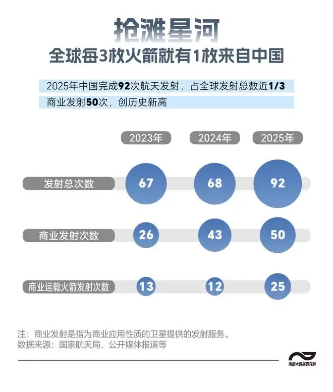 这一趋势在过去一年已初见端倪。2025年,中国全年完成92次航天发射,占全球发射总数近三分之一,其中商业发射50次,占比达54%。在这50次商业发射中,商业火箭执行了28次发射任务。连续两年商业航天任务占比过半,证明商业航天已从过去的“补充力量”,转变为中国航天发射的核心增量。